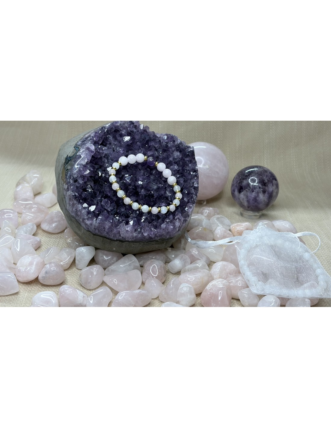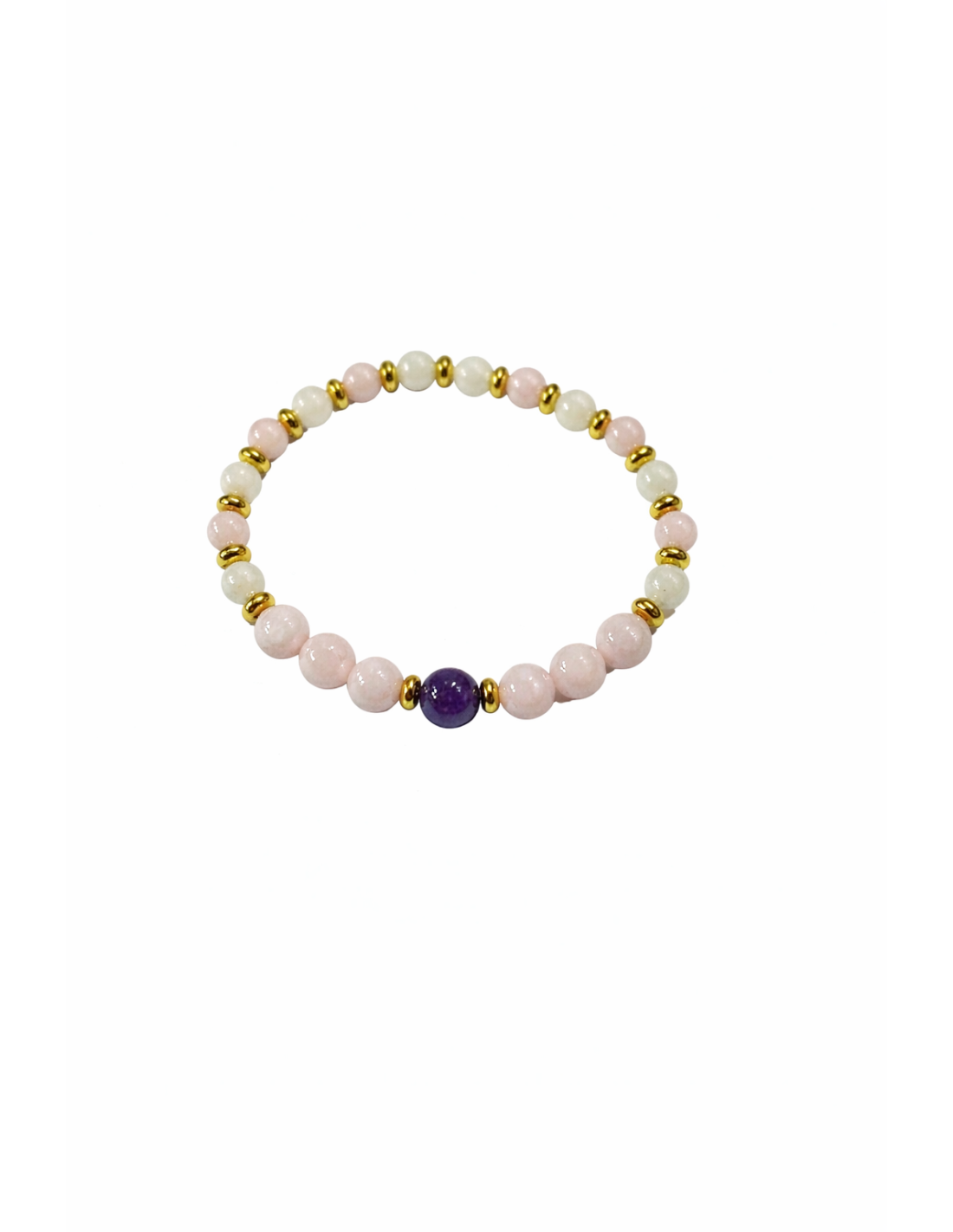 Au centre, une Améthyste de 8 mm règne en pierre maîtresse, entourée de trois Quartz Rose 8 mm de chaque côté, comme un cocon d’amour inconditionnel. Le reste du bracelet alterne Quartz Rose 6 mm et Pierre de Lune blanche 6 mm, séparés par de délicats intercalaires dorés.