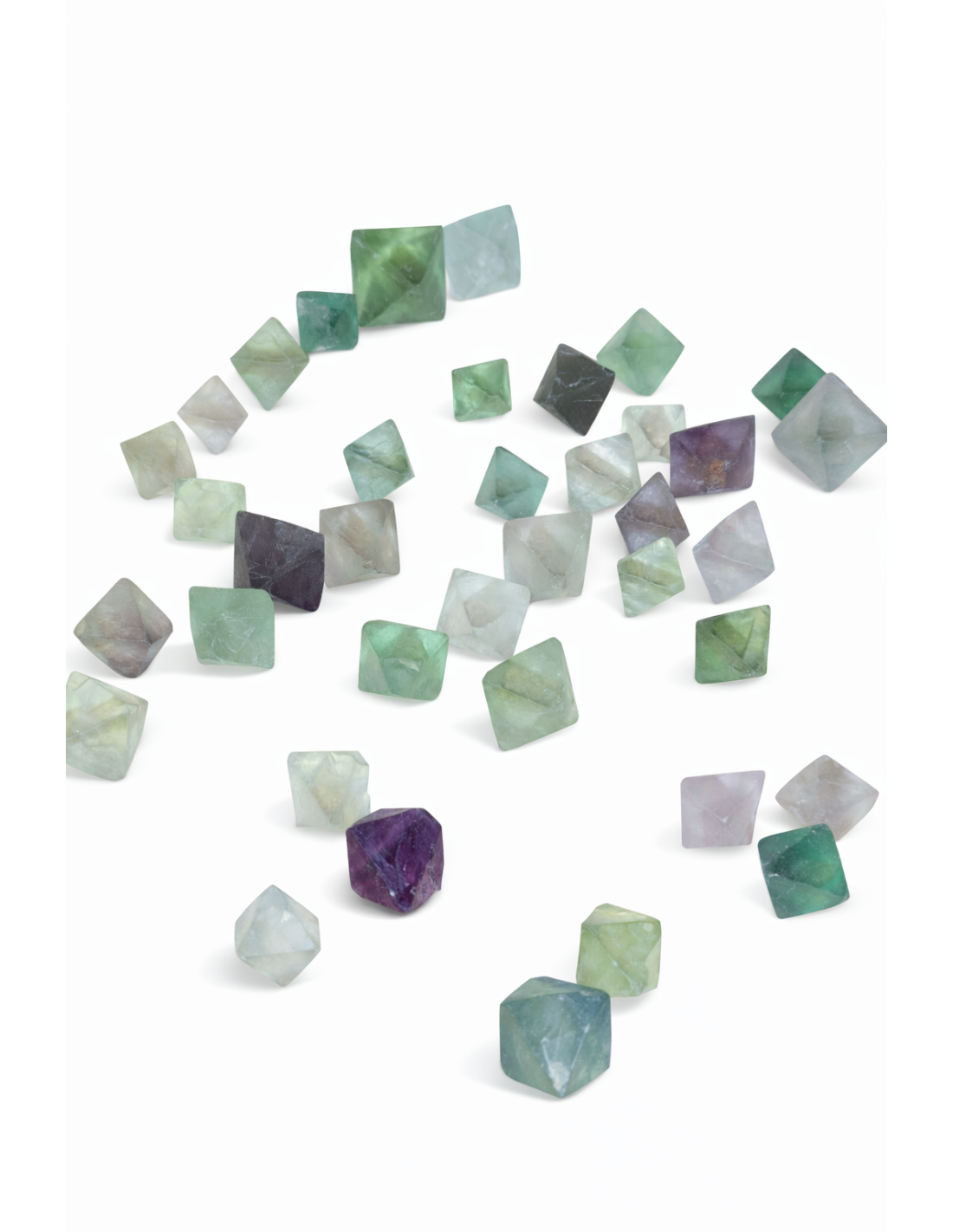 Chaque pièce révèle de magnifiques nuances naturelles de vert, parfois légèrement violettes ou translucides, rendant chaque cristal totalement unique.