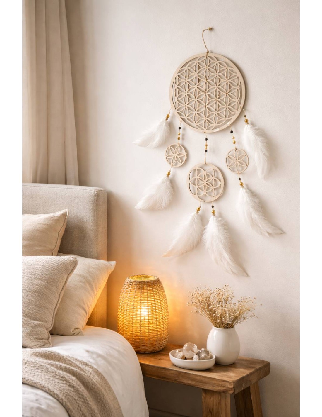 L’attrape-rêves, issu des traditions amérindiennes, est conçu pour filtrer les énergies négatives et protéger le dormeur des cauchemars. Associé à la Fleur de Vie, un puissant symbole de géométrie sacrée, il devient un outil énergétique et décoratif unique.