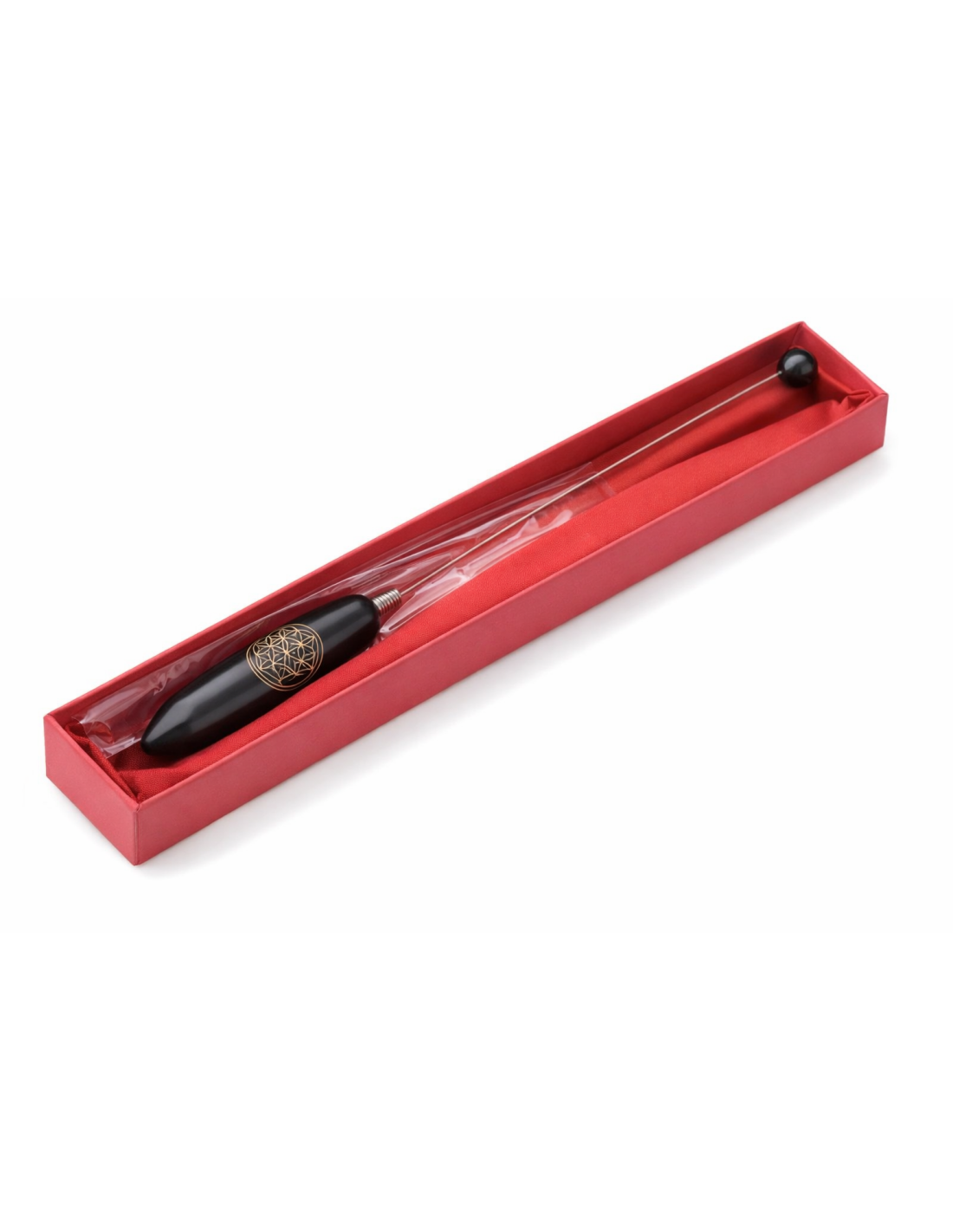 Sa poignée ergonomique et son fil métallique souple assurent un mouvement fluide, tandis que la Fleur de Vie gravée ou imprimée agit comme un amplificateur d'énergie, renforçant la précision de vos réponses.