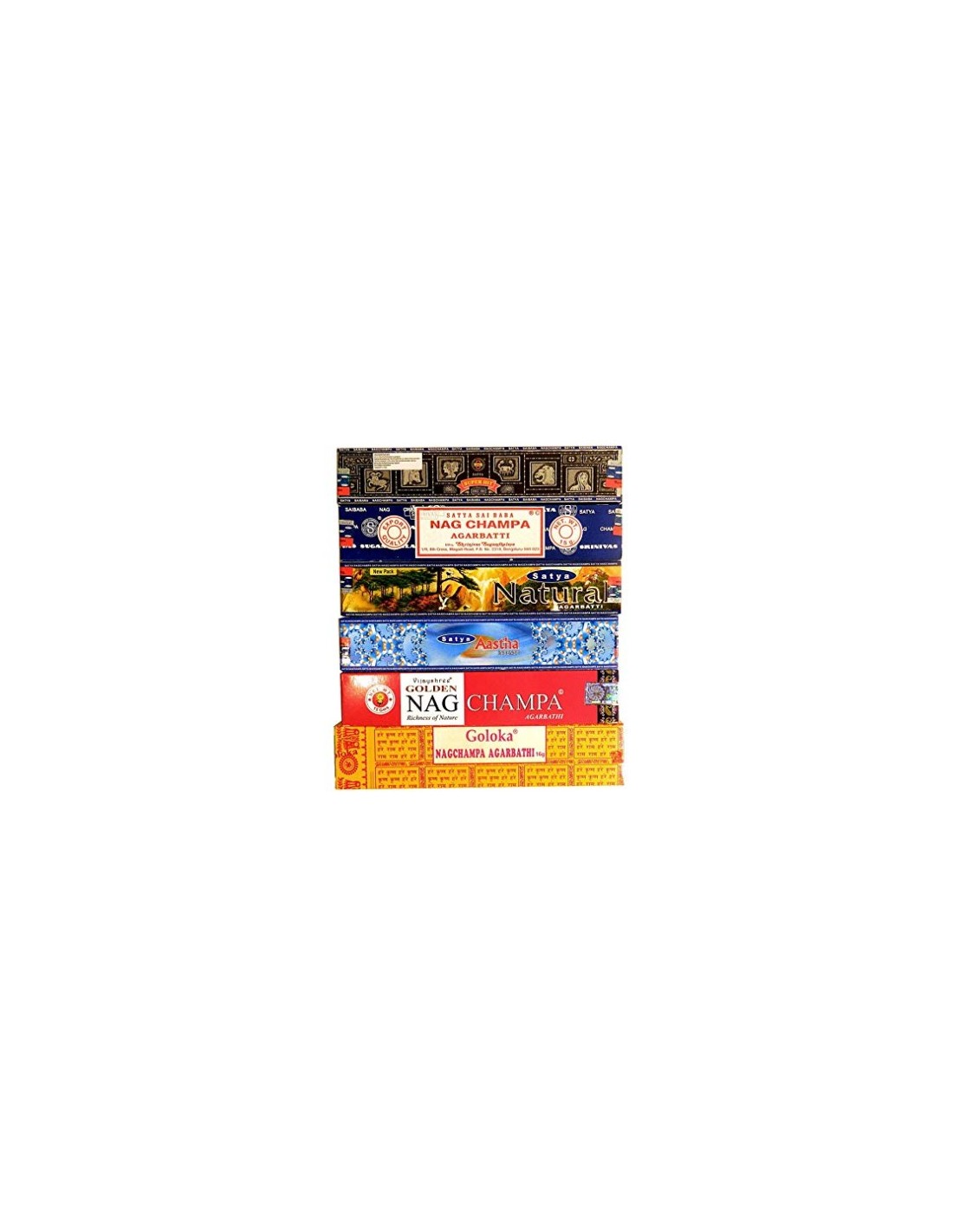 6 Variétés d'encens: Satya 1Natural, 1Super Hit, 1Nag Champa, 1Aastha, Goloka 1Nagchampa, Golden 1NagChampa